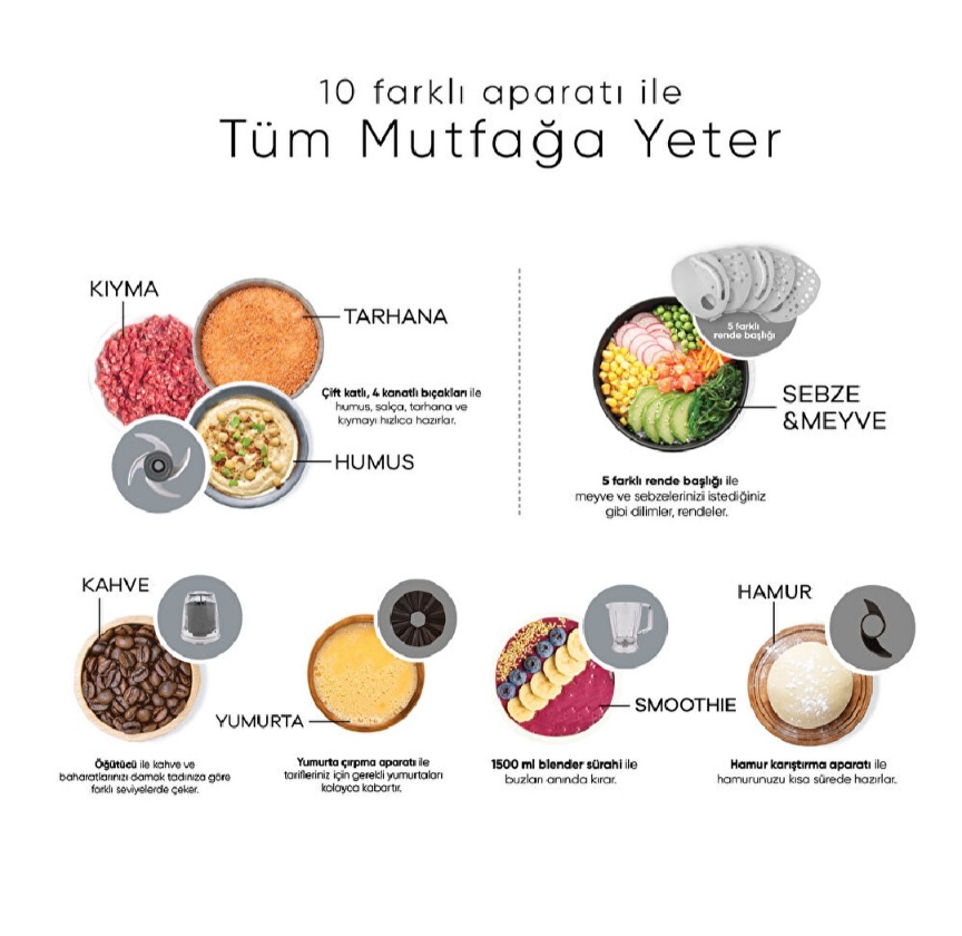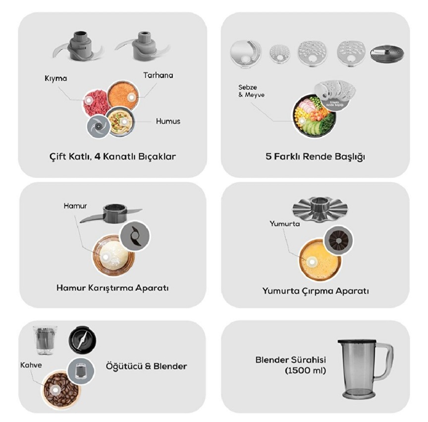 بهترین و سریع ترین عملکرد پردازش مواد غذایی را با قدرت موتور 2000 وات خود ارائه می دهد.با ظرف بزرگ 1500 میلی لیتری آن می توانید 1.5 کیلوگرم گوجه فرنگی را یکباره خرد کنید.با 10 دستگاه مختلف، عملکردهای خرد کردن، مخلوط کردن، آسیاب کردن، رنده کردن، برش دادن، ورز دادن و زدن را به صورت یکجا ارائه می دهد.تیغه های برش دولایه و 4 بال عملکرد خرد کردن عالی را ارائه می دهند.به این ترتیب می توانید به سرعت غذاهایی مانند هوموس، رب گوجه فرنگی، گوشت چرخ کرده و ترحنا را تهیه کنید.می توانید با خرد کردن یخ با پارچ مخلوط کن 1000 میلی لیتری نوشیدنی های خود را به سرعت آماده کنید.با دستگاه آسیاب، می توانید قهوه و ادویه ها را در سطوح مختلف با توجه به ذائقه خود آسیاب کنید.میتوانید تخممرغهای مورد نیاز دستور غذا را با ضمیمه همزن تخممرغ بزنید.با دستگاه خمیرورز می توانید در مدت زمان کوتاهی خمیر یکدستی به دست آورید.با 5 سر رنده استیل ضد زنگ مختلف می توانید میوه ها، سبزیجات و پنیرهای سفت را به اشکال مختلف برش داده و رنده کنید.به لطف پایه های ضد لغزش، بدنه در حین کار ثابت می ماند.لوازم جانبی آن در ماشین ظرفشویی قابل شستشو بوده و به راحتی جدا و وصل می شوند.